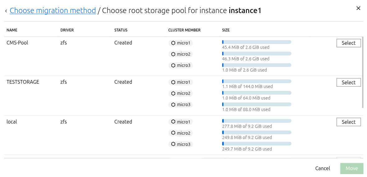 Within the move modal, click Move instance root storage to a different pool to view available storage pools to move to.